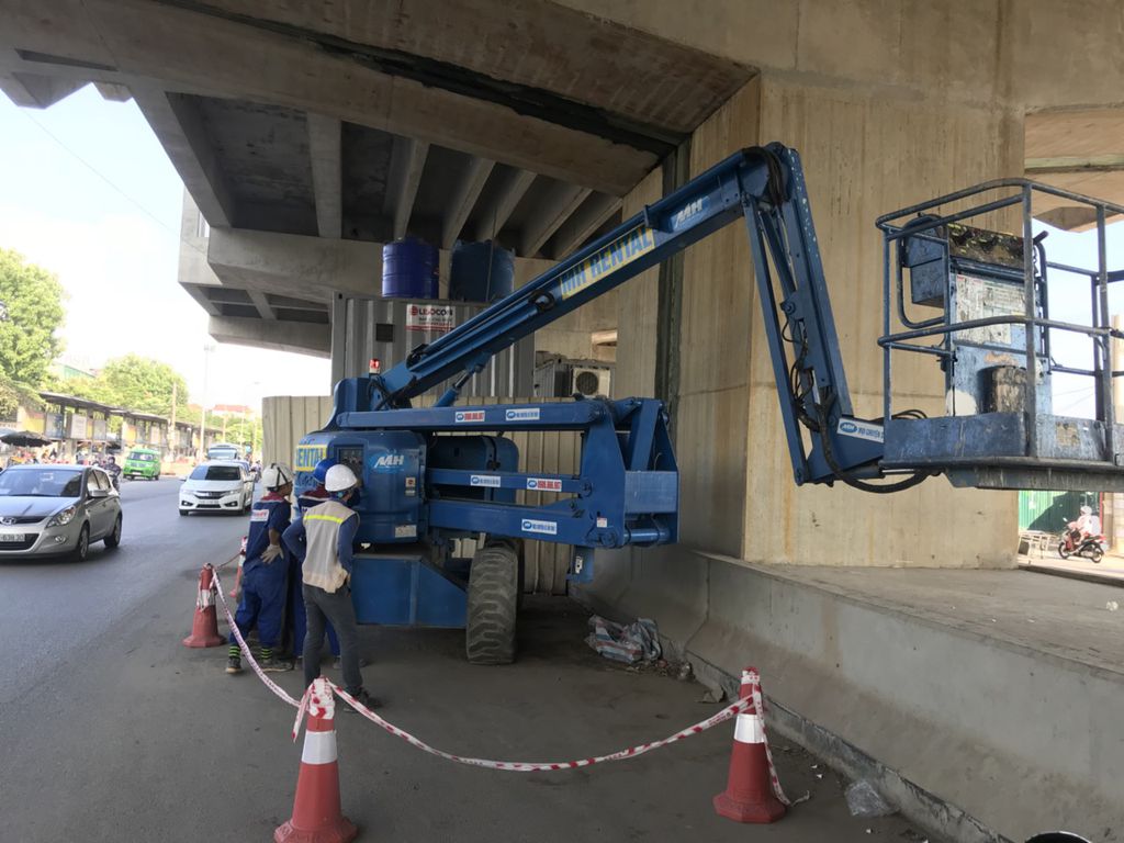 Xe nâng người boom lift 20m làm việc kiểm tra bên dưới đường trên cao